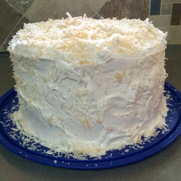 Add the toasted coconut uniformly to the top and the sides of the cake, creating a beautiful finished cake